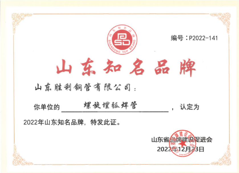 山東勝利螺旋埋弧焊管產(chǎn)品順利通過2022年度“山東知名品牌”榮譽認證。2022年7月26日認證工作啟動后,公司積極參加認證工作,認真組織各項申報材料,登錄認證平臺提交申報材料,并承諾確保申報材料的真實性、準確性和有效性?!吧綎|知名品牌”榮譽的獲得,將大大有助于公司螺旋埋弧焊管進一步拓寬省內(nèi)外銷售市場,有助于爭取更多的社會市場訂單。
